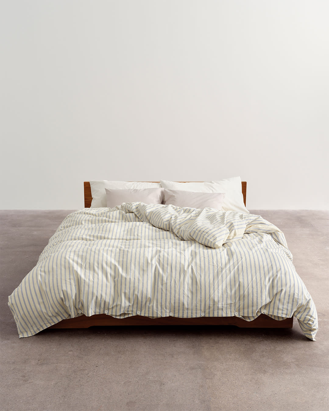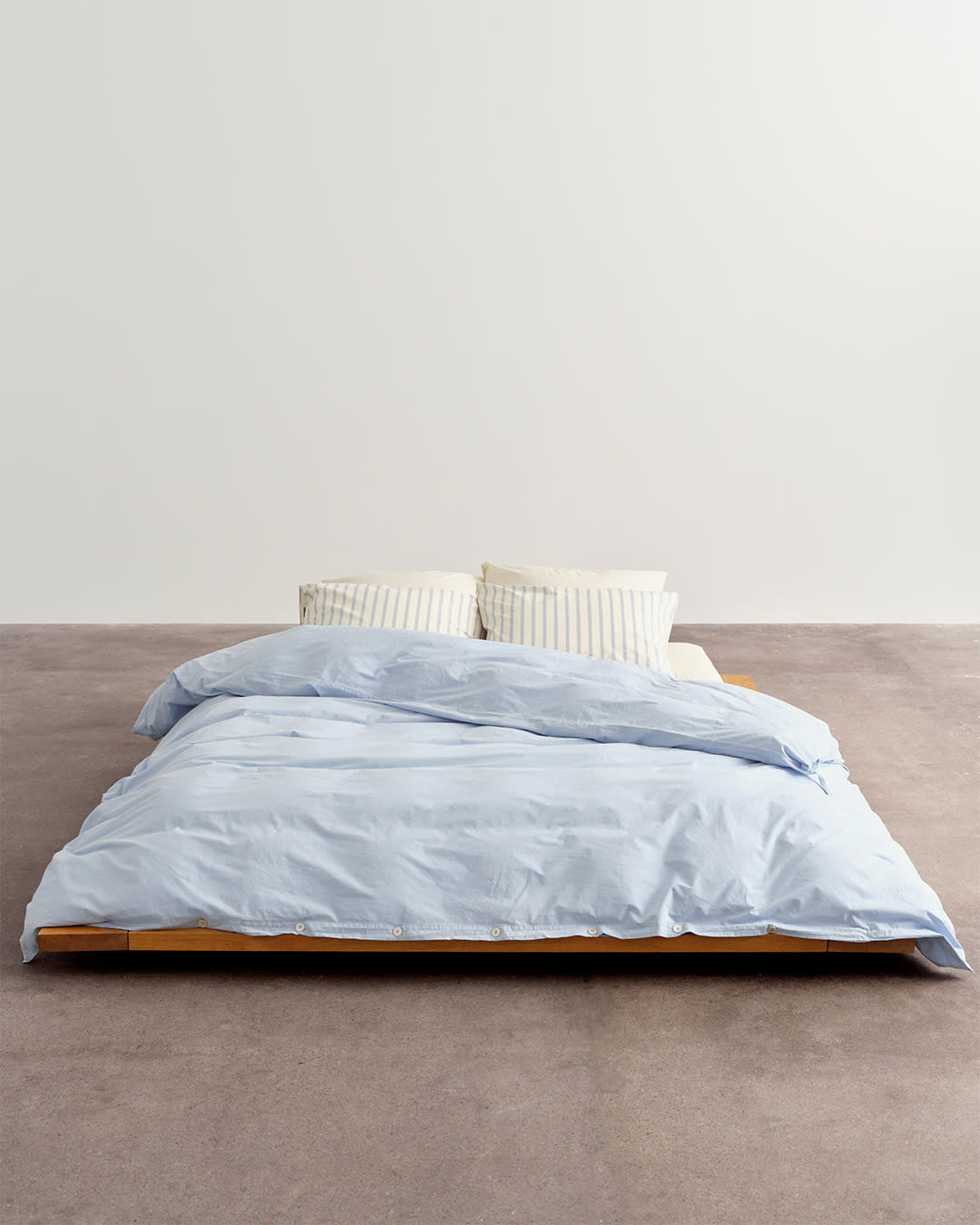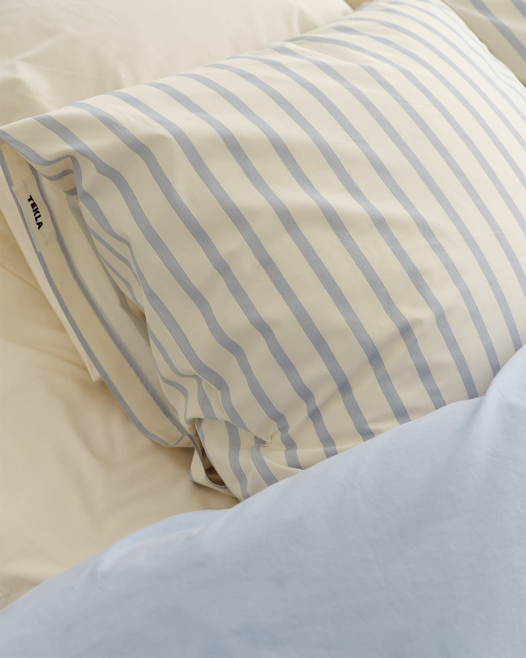 Percale bedding in Morning Blue, Needle Stripes and Winter White. A classic aesthetic reworked in contemporary tones.