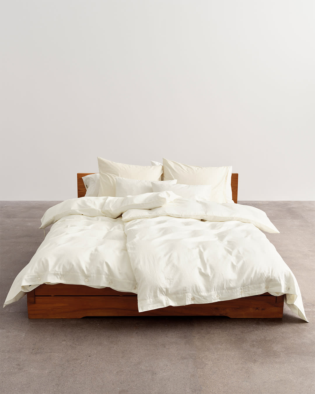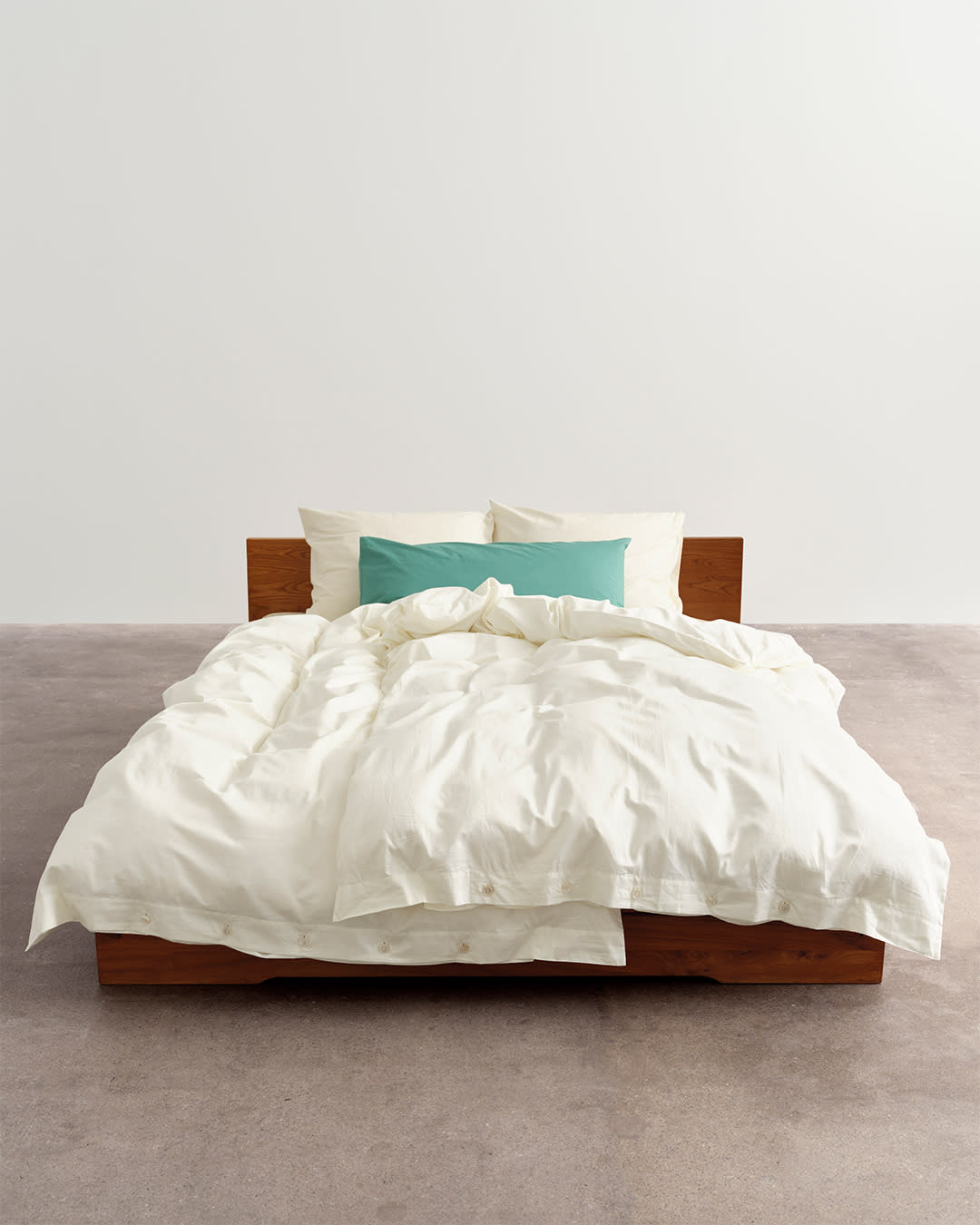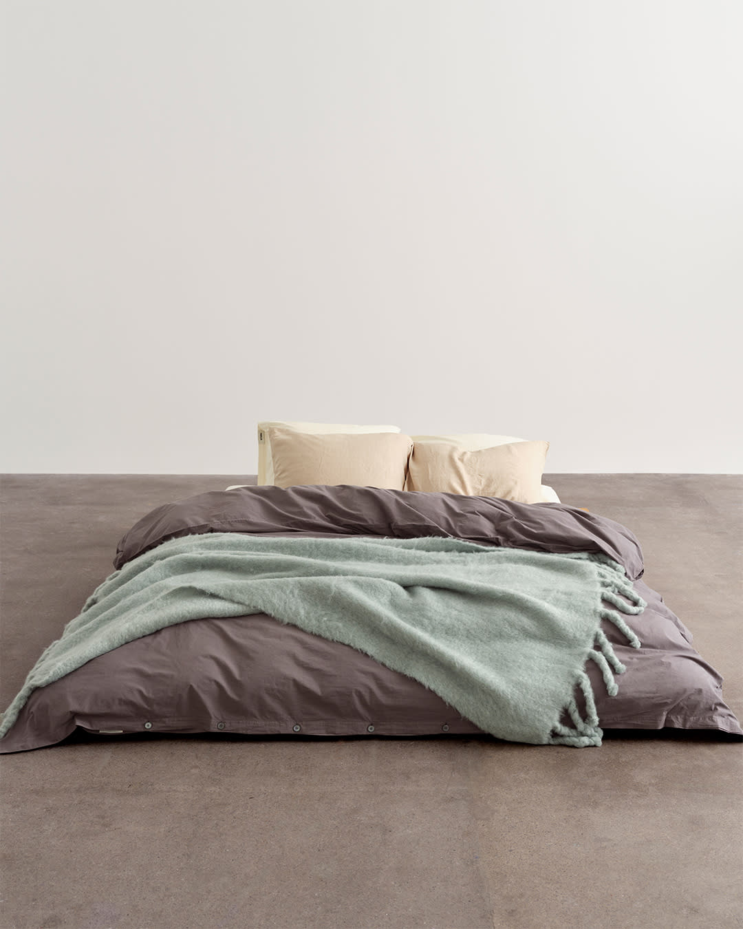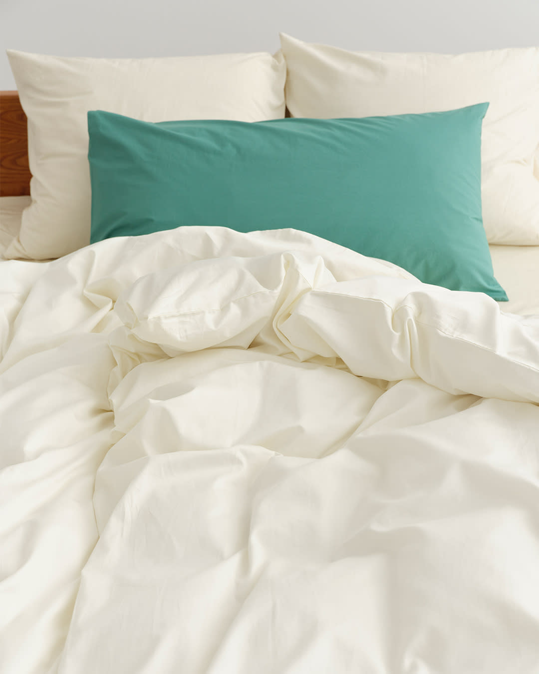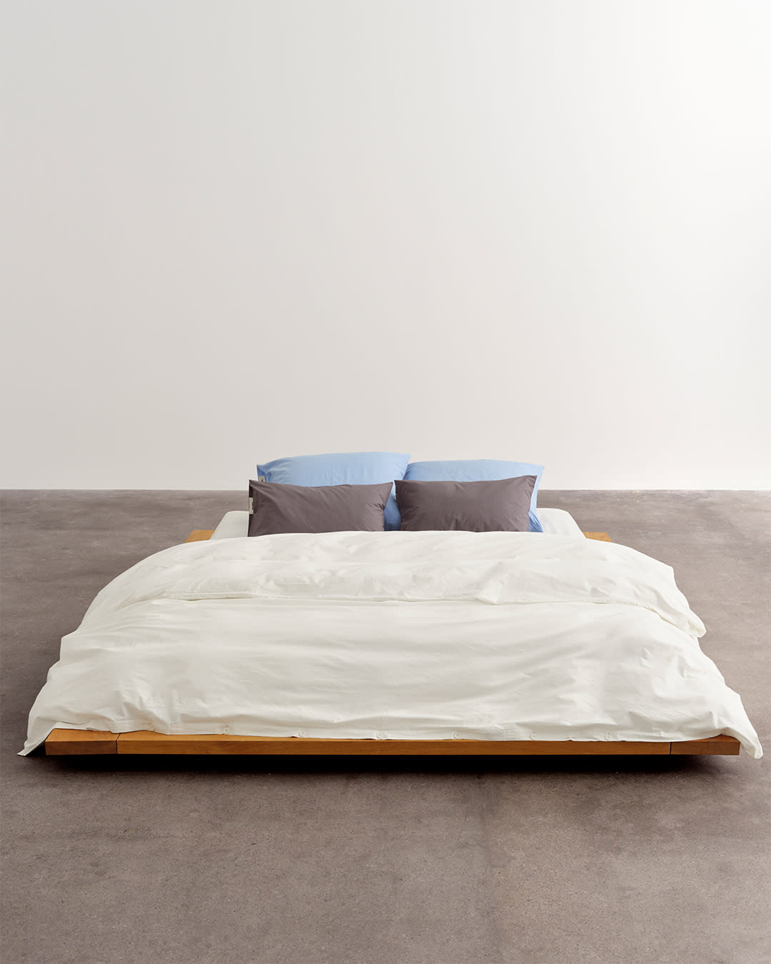 Percale bedding in Broken White, Morning Blue and Dark Taupe. Create light and shade with cool hues.