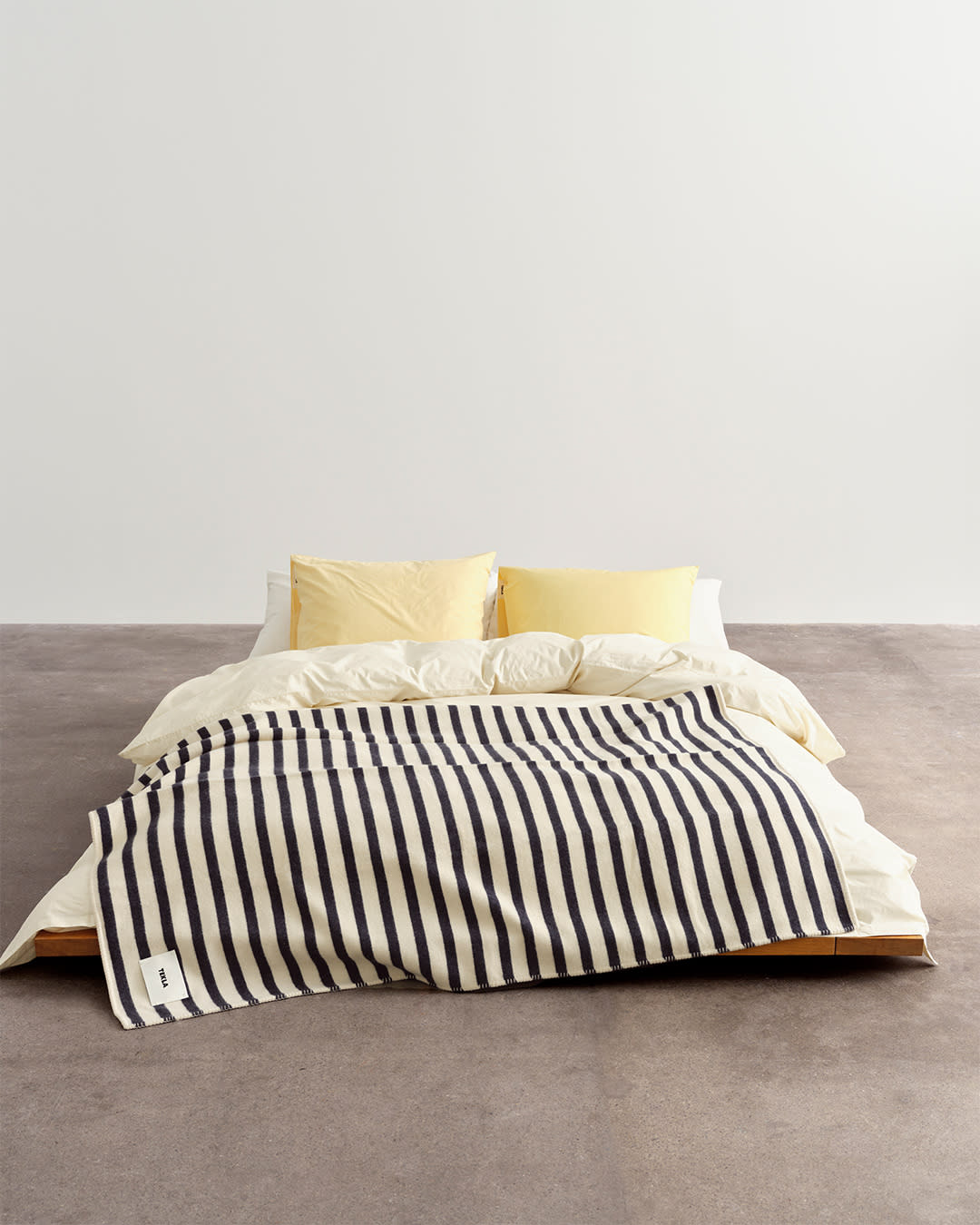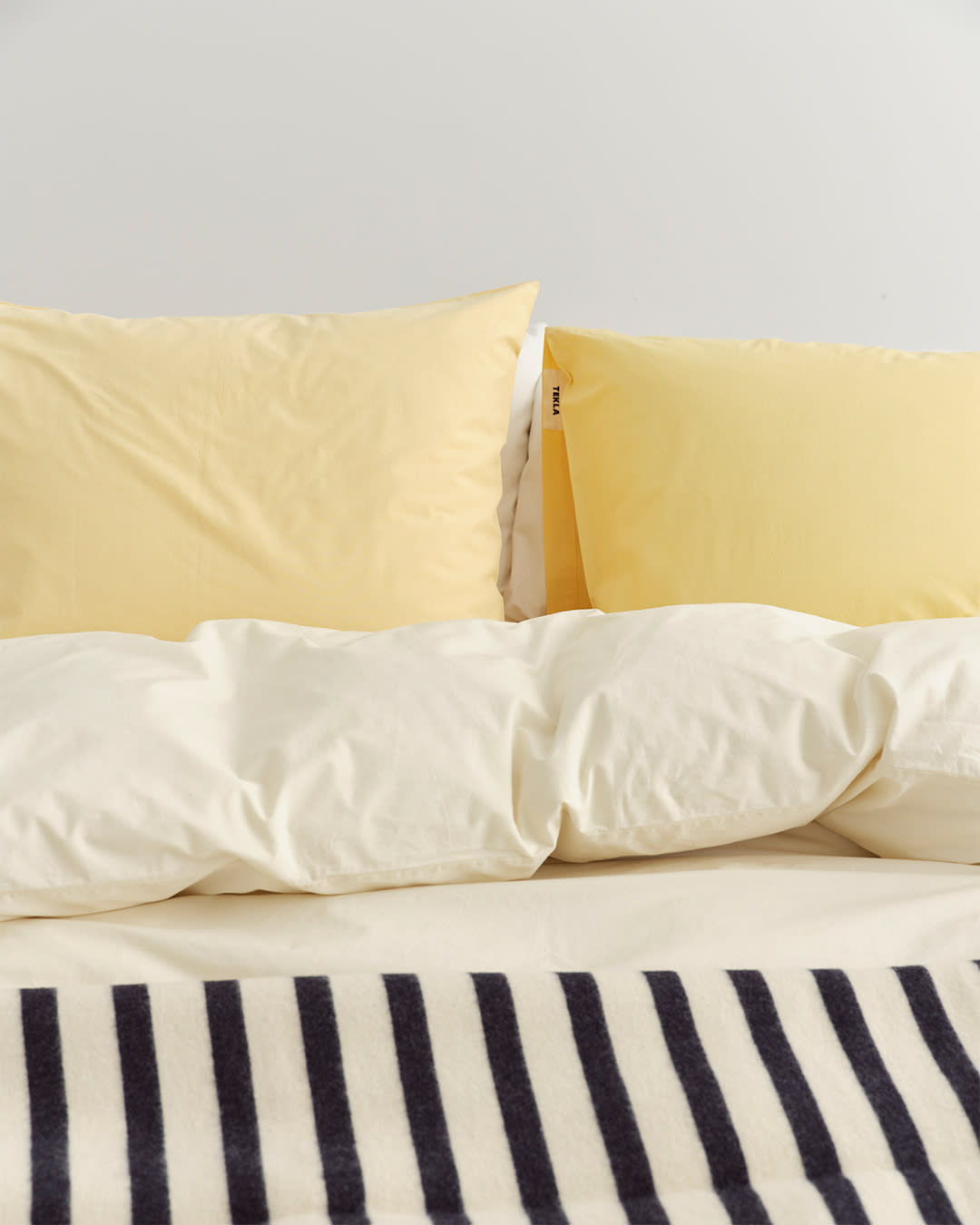 Percale bedding in Winter White, Broken White and Soft Yellow. Lambswool blanket in Magpie Stripes. Subtle colour tempers bold stripes for gentle vibrancy.