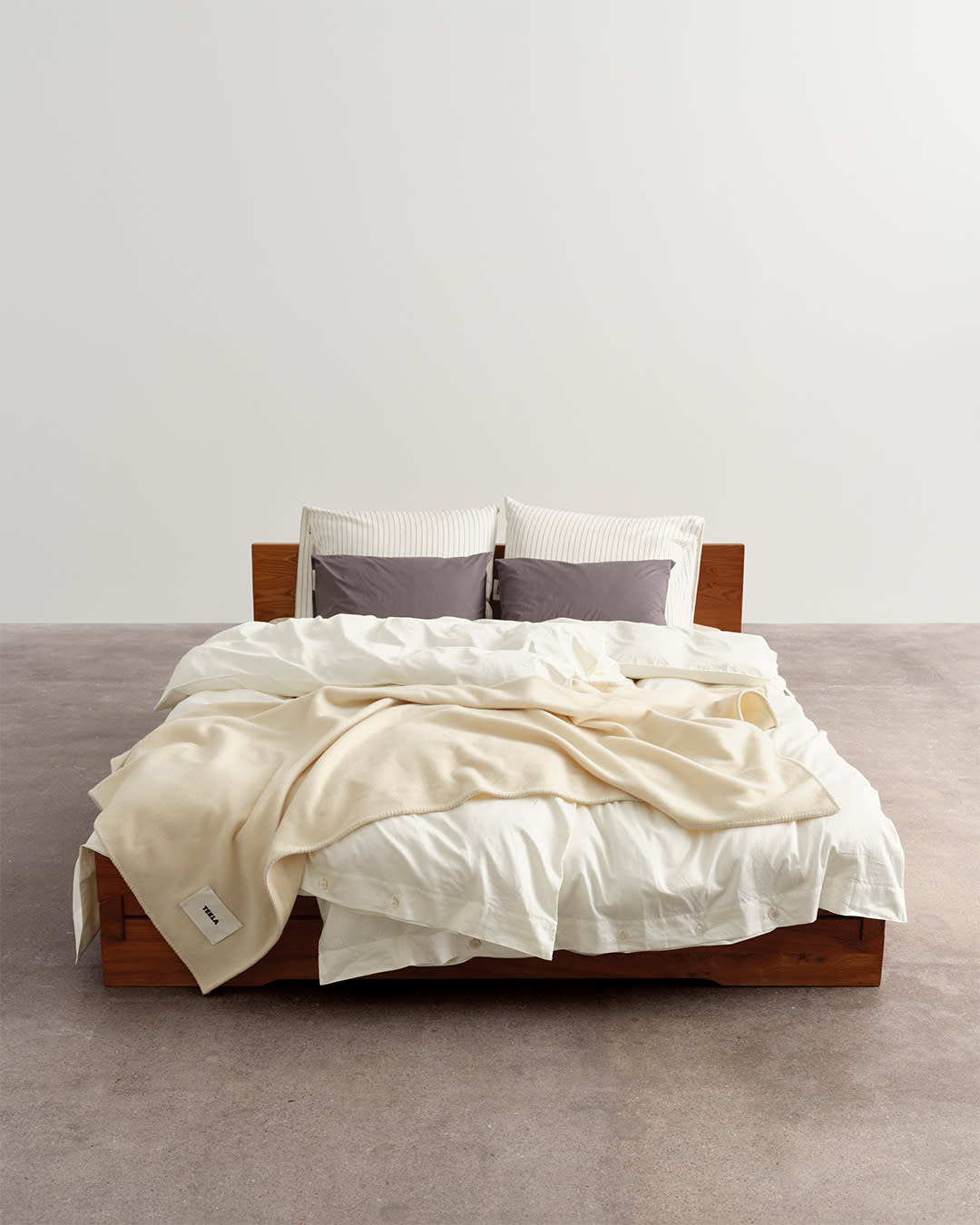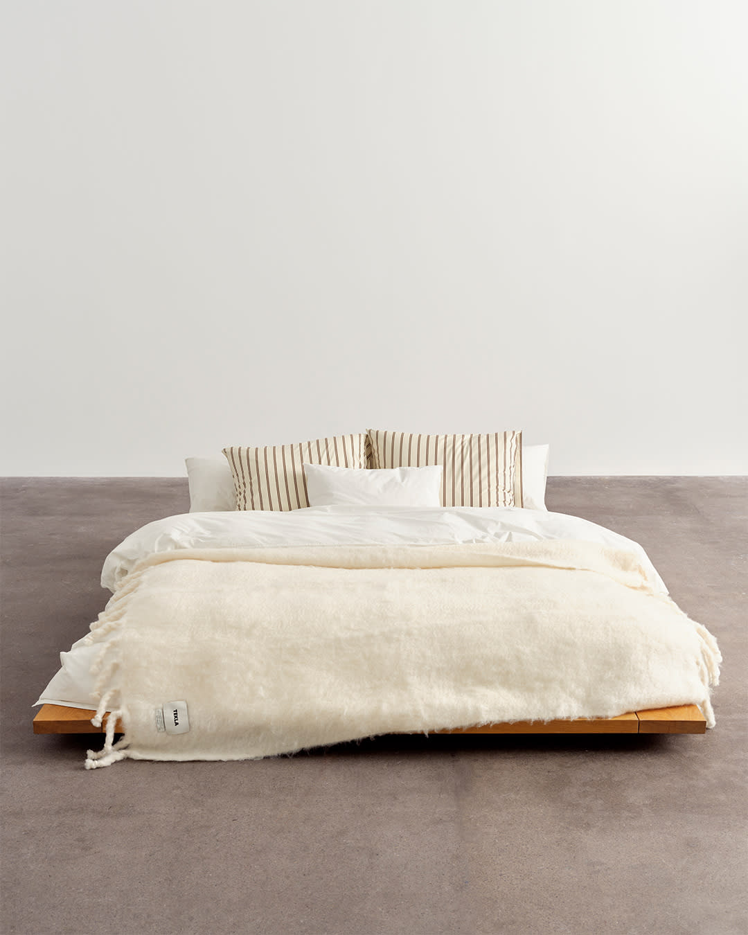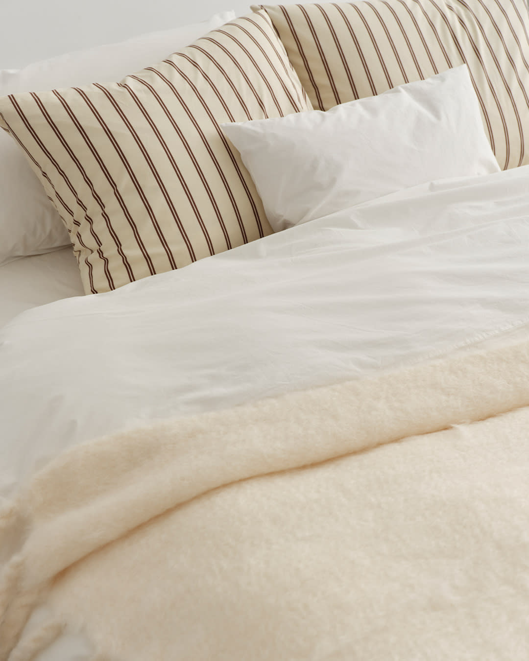 Percale bedding in Broken White and Hopper Stripes. Mohair blanket in Blanc. Cream tones tempered with stripes.