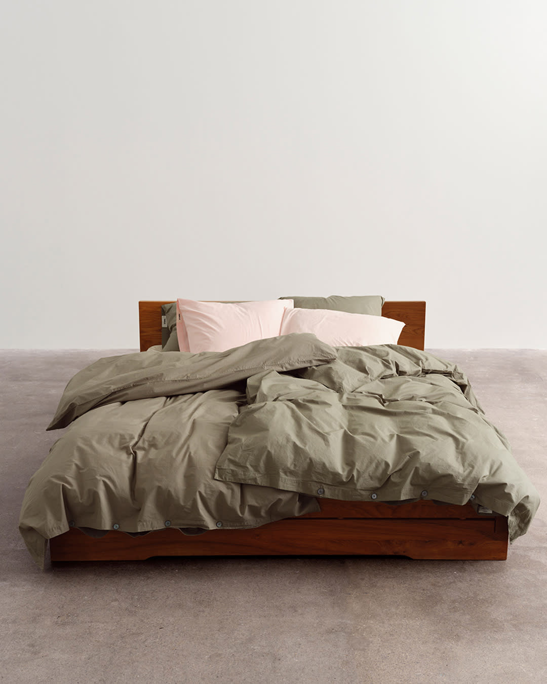 Percale bedding in Olive Green and Mallow Pink. Earthy tones play with bold brights.