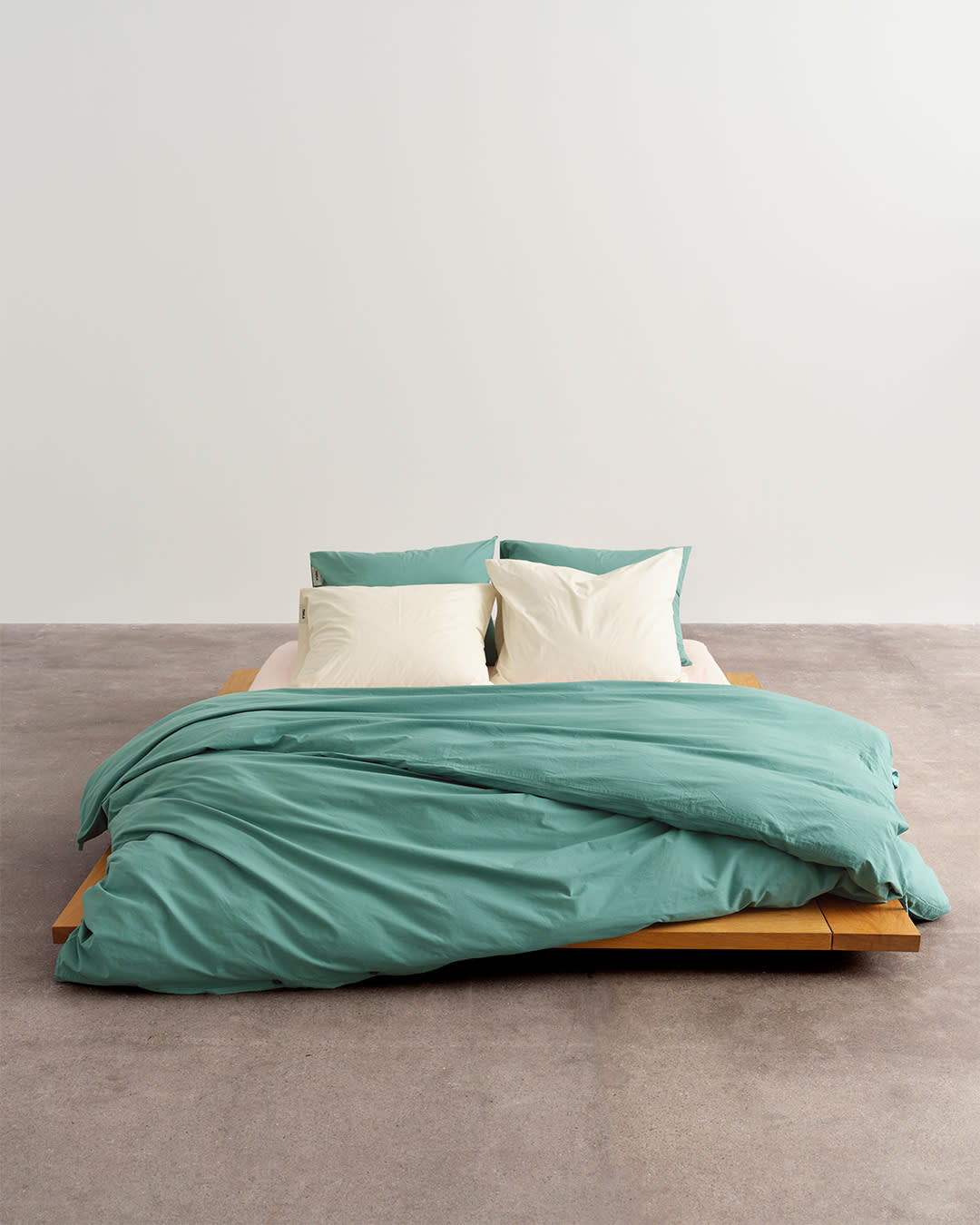 Percale bedding in Vintage Green, Winter White and Petal Pink. Vibrant colours are cut with muted tones.