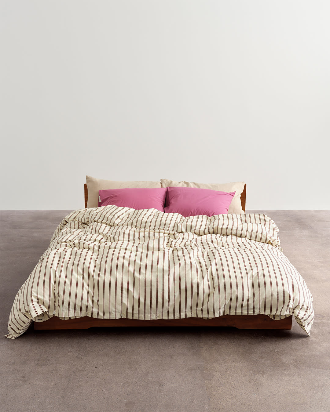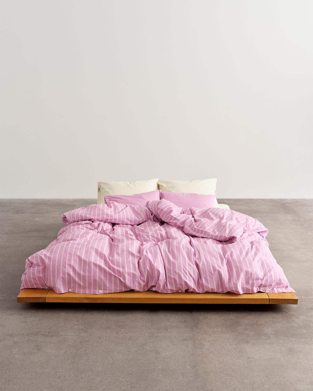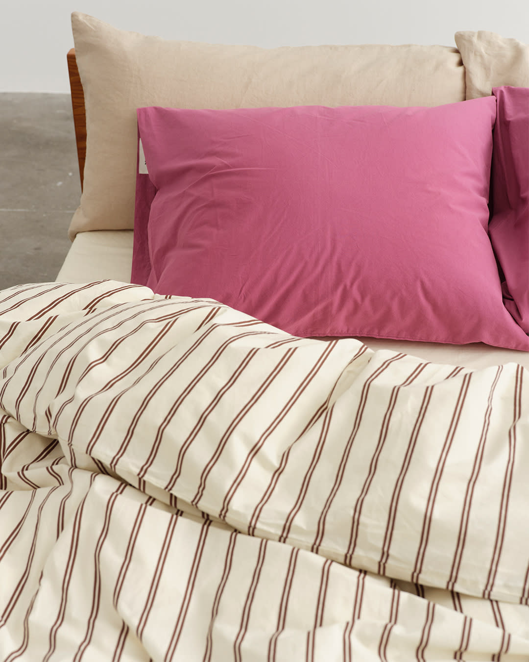 Percale bedding in Mallow Pink Stripes, Winter White and Mallow Pink. Striped pieces tie contrasting colourways together.