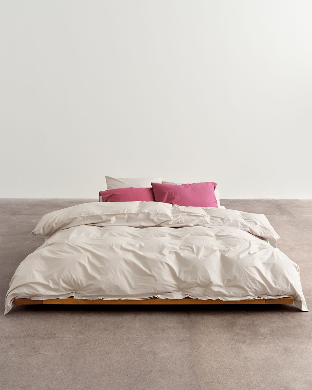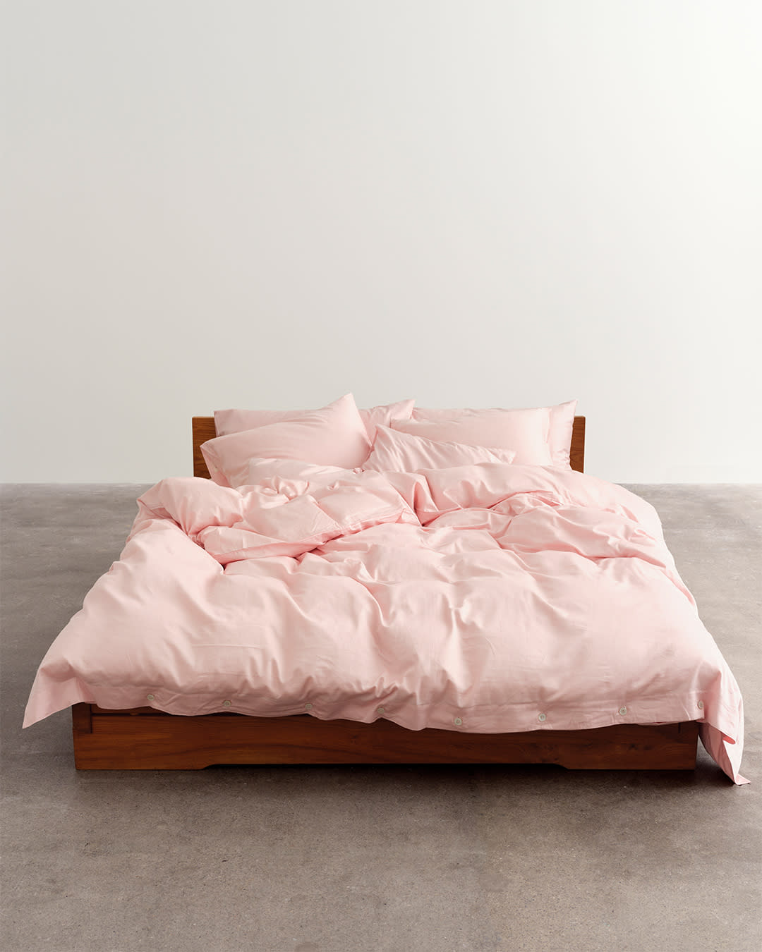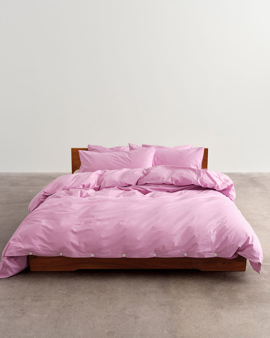 Percale bedding in Mallow Pink. Muted brights welcome a gentle vibrancy.