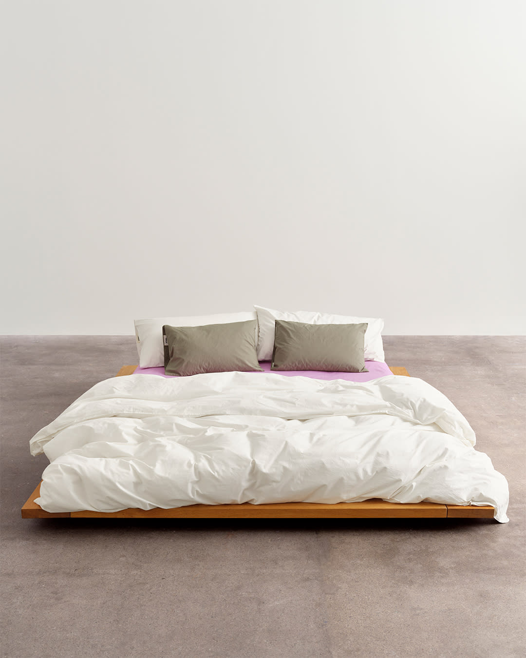 Percale bedding in Broken White, Olive Green and Mallow Pink. Classic white bedding is twisted with earthy and bold tones.