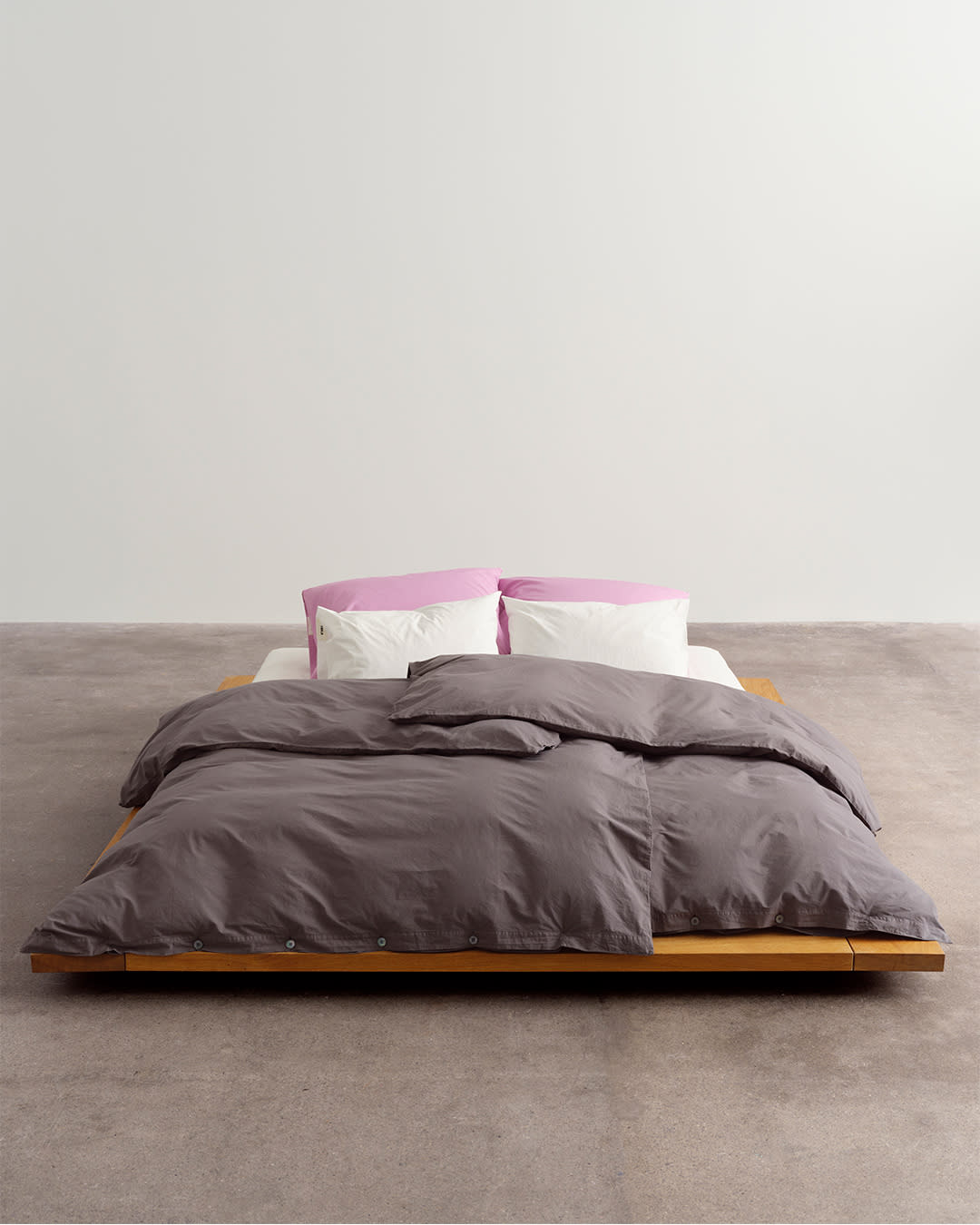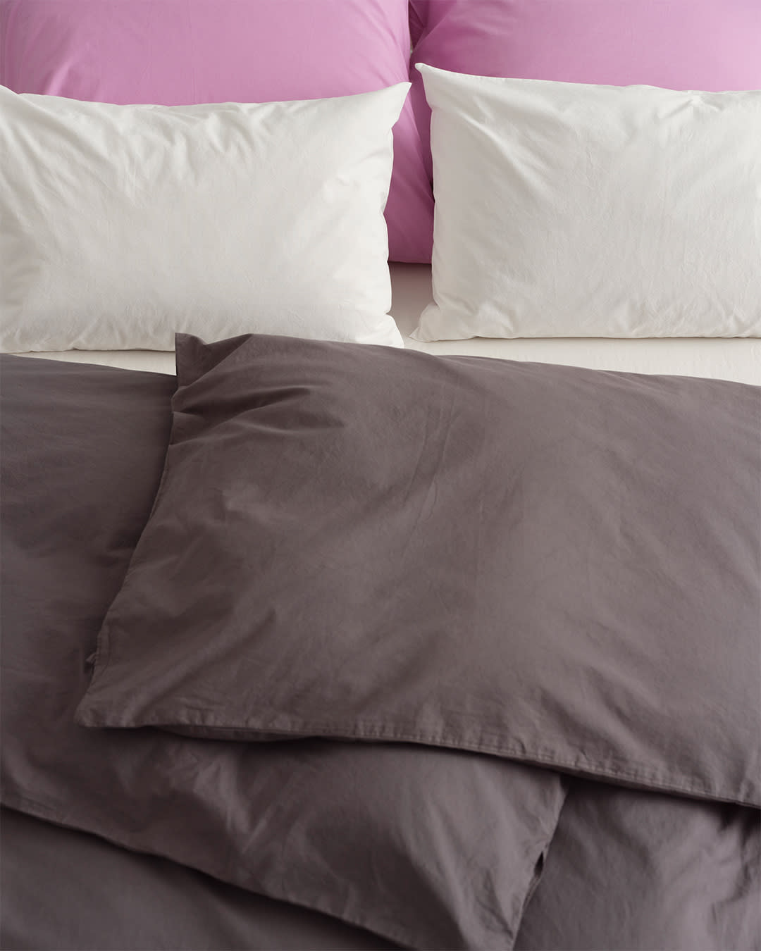 Percale bedding in Dark Taupe, Mallow Pink and Broken White. An evocative palette of soft and creamy colourways.