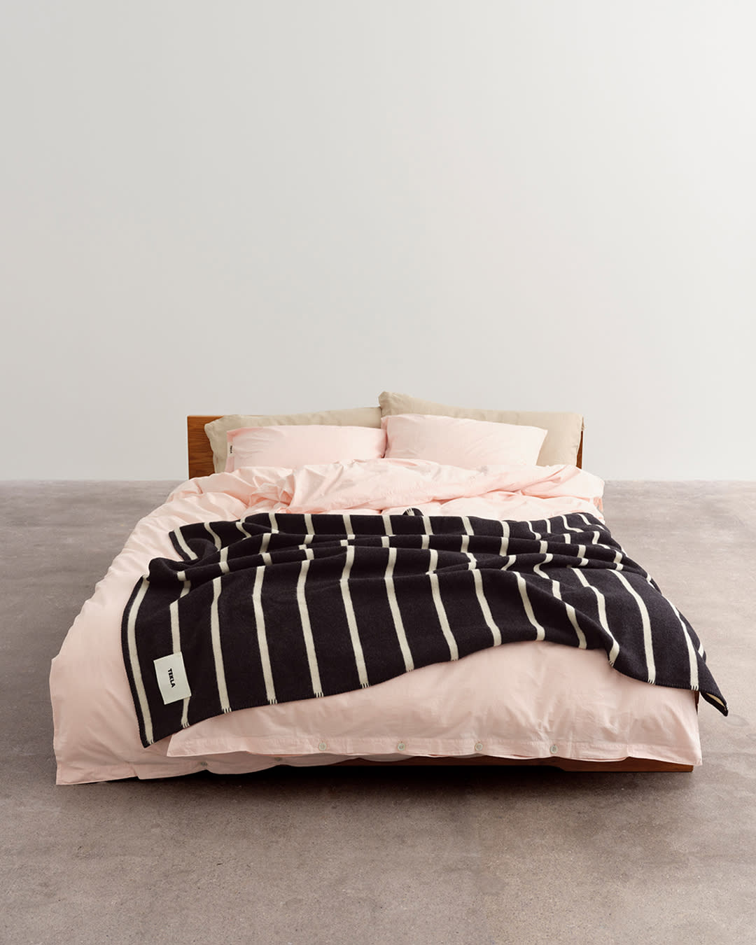 Percale and linen bedding in Petal Pink and Sandstone. Lambswool blanket in Starling Stripes. Pale tones brighten bold black and white.
