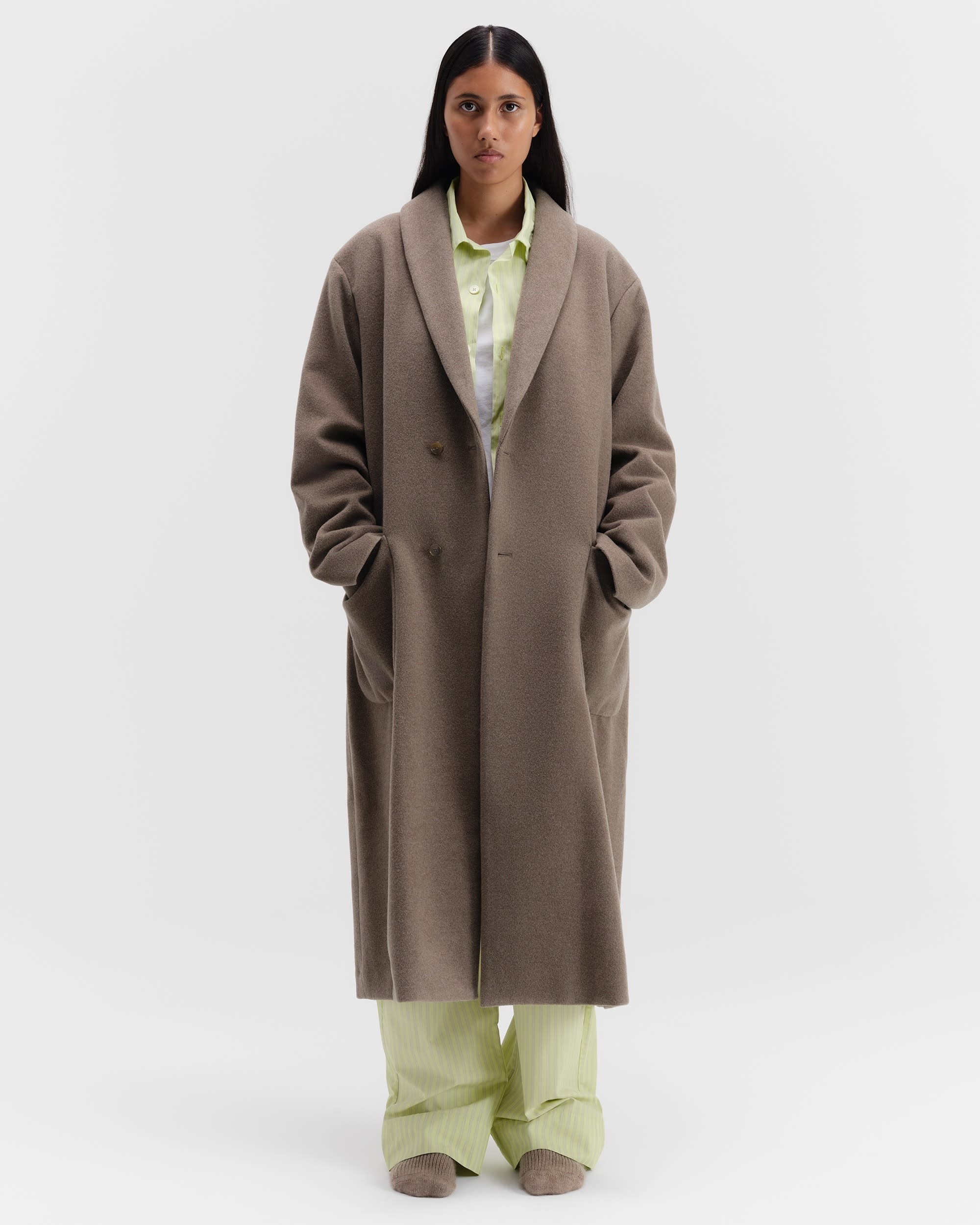 The outerwear collection is suited for cold and inclement weather. Made using ultra-fine merino wool with a smooth and soft hand feel, the robe coat is inspired by comforting dressing gowns.