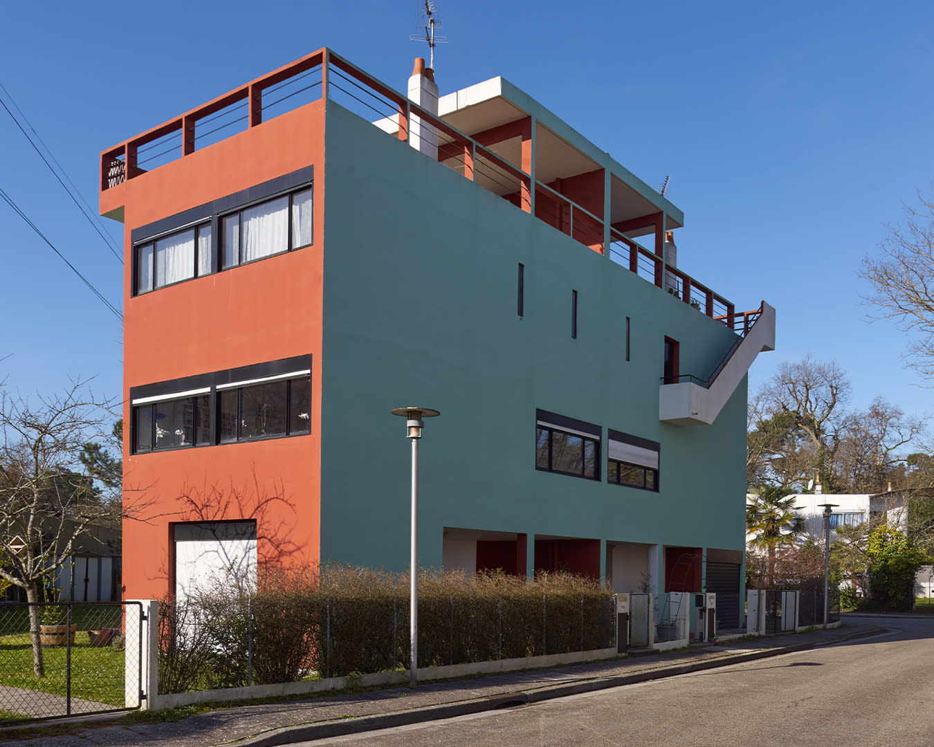 Cité Frugès de Pessac broke from the conventional “lean-to” housing type common in Bordeaux at the time, opting for cubic structures with flat roofs and elongated, horizontal windows. Despite being based on a modular system of 5 x 5m, the houses were varied, with five distinct types: the two-story staggered quinconces, zig-zag, arcade, free-standing isolé and the three-story gratte-ciel (skyscraper). Several of them had roofed but not walled areas, to be used as terraces or garages. Le Corbusier intended to use poured concrete but had to settle for clinker block placed by hand, all finished with coloured facades added at the request of Frugès.