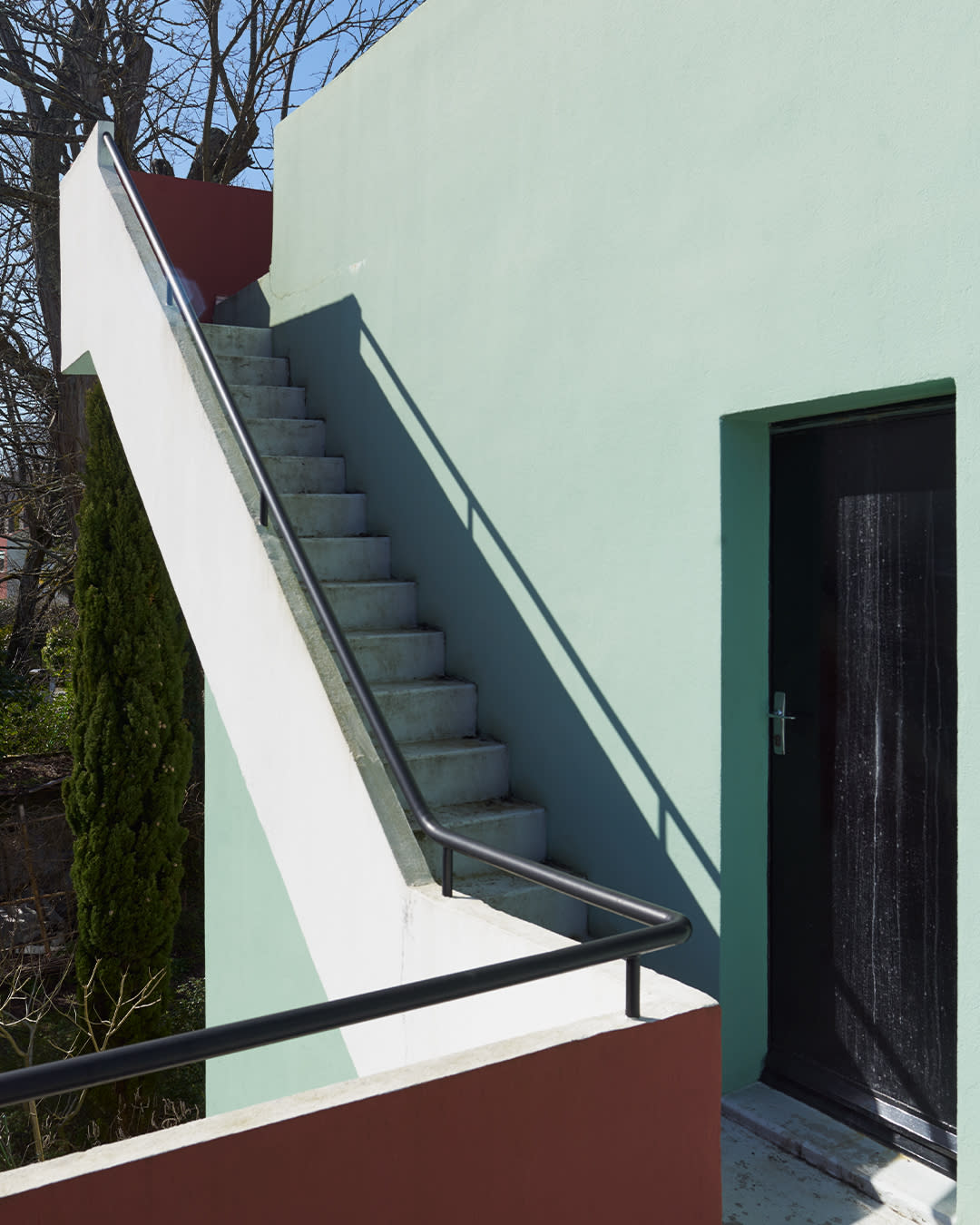 From this, Le Corbusier selected ‘horizon blue’, golden yellow, jade green, off white and maroon colours which were used on exterior walls and carried through into the interior detailing.
