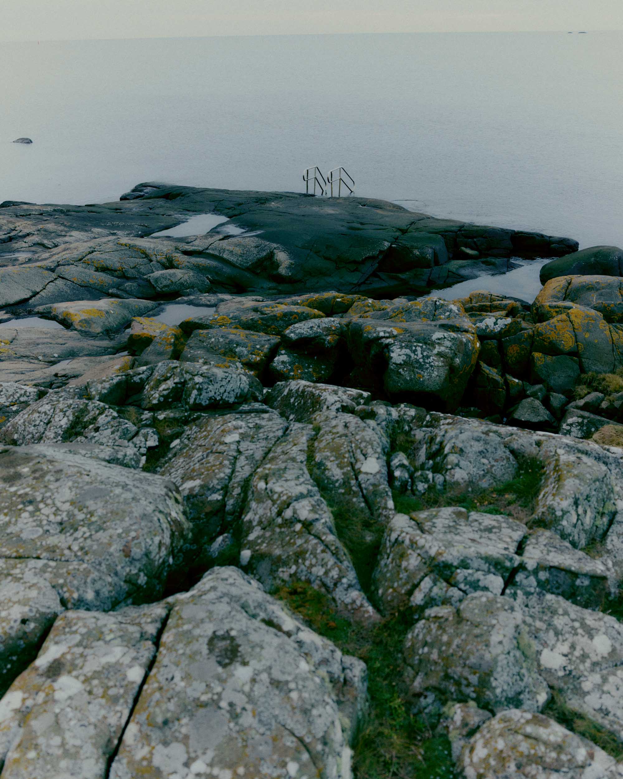 Further down the coastline, there is another, more simple bathing spot. An L-shaped building with a flat roof and concrete porch that looks out onto the coastline. Inside, there is a room filled with the paraphernalia of community admin – a kettle, a spare change box, some folders – and a small sauna with stacked seating. A single promenade runs in a straight line from the sheltered changing area to the sea. At its end, two ladders extend into the cold water. This is Skarpa Kvinns, a community-ran bathing association located at Skarpa Norde, an area of Varberg’s coast designated for women to bathe nude.